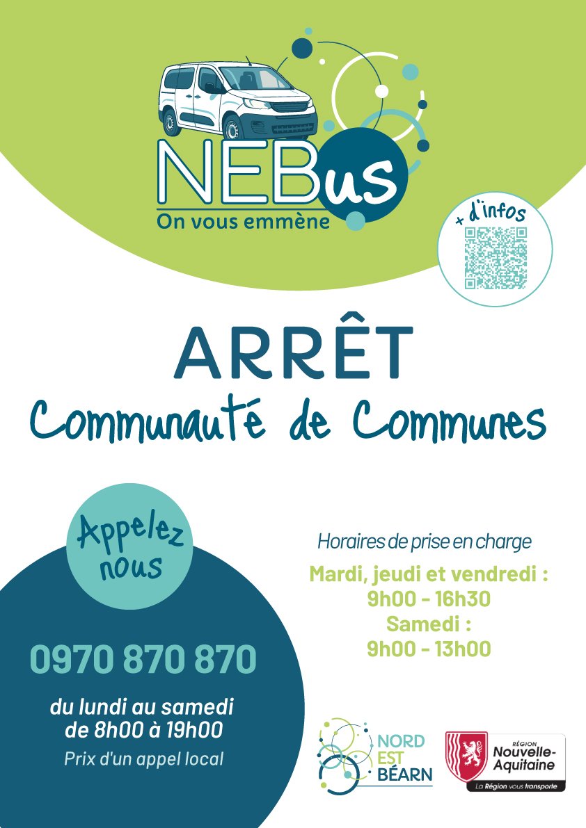 A partir du 1er septembre, la Communauté de Communes met en place son service intercommunal de transport à la demande (TAD) : NEBus, un service de transport collectif qui permet à vos habitants de réaliser des déplacements ponctuels et de proximité sur le territoire.